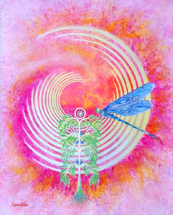 Elevation l – All of humanity is now in an evolutionary process, a new paradigm shift, which I give a symbolic expression to in this work. Everything difficult that is currently happening on our earth is a form of eliminating the old and outdated, that which no longer lasts, that which is not helpful for the personal and spiritual development of man. The old no longer lasts and in order to be able to reach a more joyful and conscious. That is what evolution is about – one’s consciousness that rises, and lifts itself, above the old. Symbolically, the western and eastern hemispheres of our globe are also visible. My subconscious painted 7 flower petals on both the right and left sides. I did not see that until afterwards, and interpret it as the western part of the earth needs to become more equal with the eastern one in order to balance so that harmony can prevail in our world. Elevation l / Mänsklig MedvetandeFörhöjning – Blandteknik akvarell och rinnande akryl, 30×40 cm ~ ~ ~ ~ ~ Beskrivning: Hela mänskligheten är nu inne i en evolutionsprocess, ett nytt paradigmskifte, vilket jag ger ett symboliskt uttryck för i detta alster. Allt besvärligt som för närvarande sker på vår jord är en form för undanröjande av gammalt och förlegat, sådant som inte håller längre, sådant som inte är hjälpande för människans personliga och andliga utveckling. Det gamla håller inte längre och för att kunna nå en mer glädjefull och ljusare plats att leva på måste allt tungt och svårt komma upp till ytan först. Denna bild vill berätta om ett lyft avseende människans medvetande. Det är vad evolution handlar om – ens medvetande som höjer sig, och lyfter sig, över det gamla. Symboliskt syns även den västra och östra hemisfären av vårt klot. Mitt undermedvetna målade 7 blomblad både på den högra och vänstra sidan. Det såg jag inte förrän efteråt, och tolkar det som att västra delen av jorden behöver bli mer jämställd med den östra för att balansera så att harmoni ska kunna råda i vår värld.