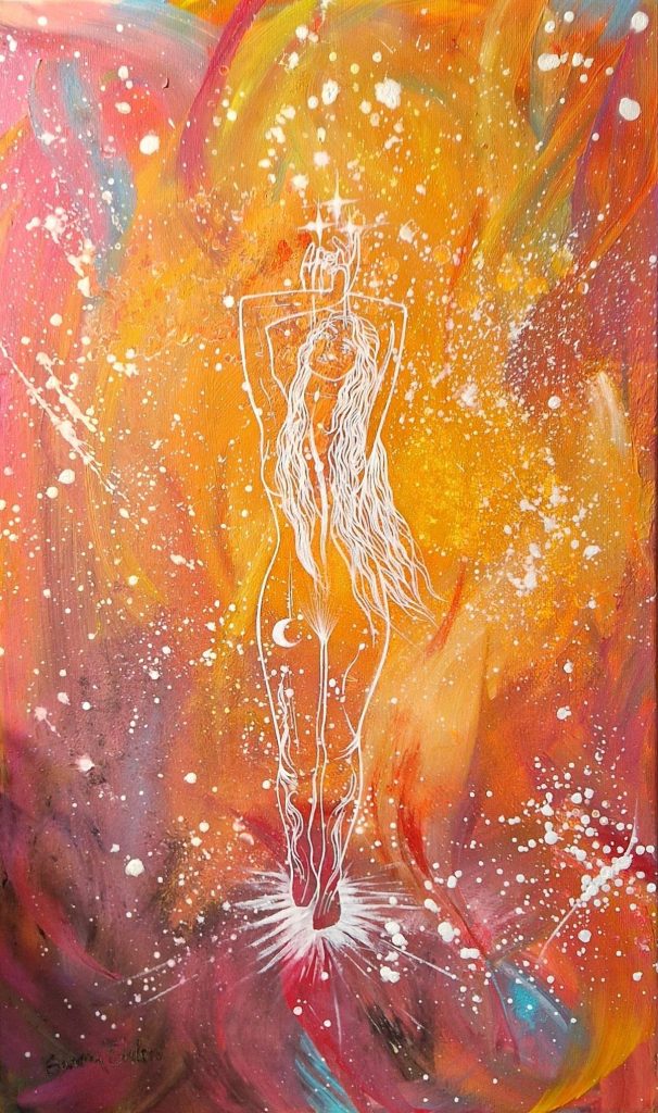 *Inner flame* – Ignite your inner flame and let it fuel your journey (Tänd din inre låga och låt den ge näring åt din resa… som vägleder dig att uppfylla din själs vision.) Akryl på canvas, 60×36 cm