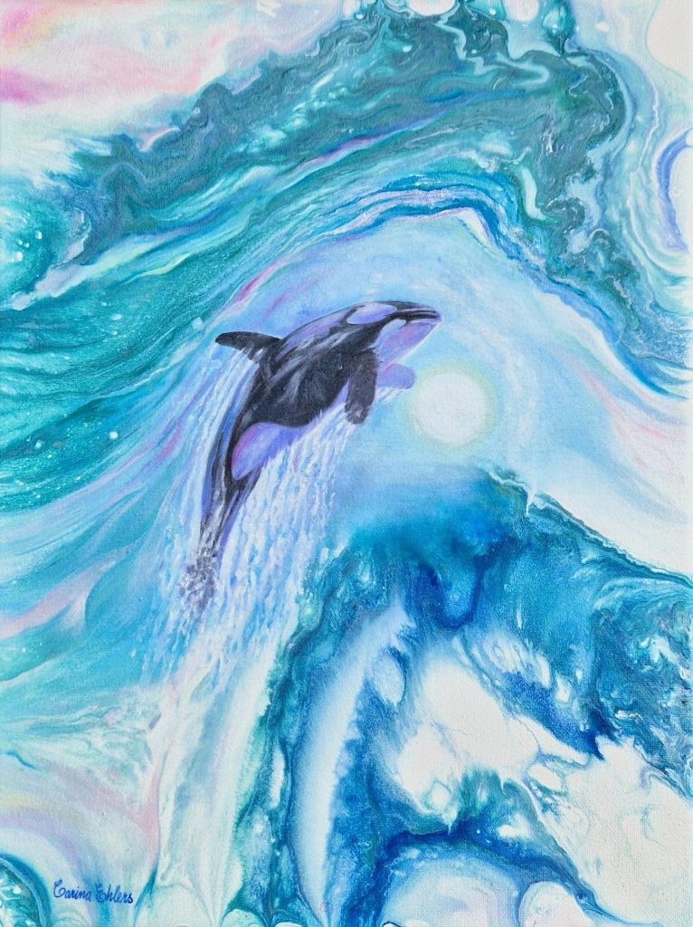 Orca Spirit – (späckhuggare) Blandteknik olja/akryl, 30×40 cm Som andedjur symboliserar Orca bland annat helande, läkande och är kraftfull, intelligent med ett stort hjärta. Är inte rädd för att dela sina känslor med sina nära och kära. Den visar kreativitet, lojalitet och skicklighet. Den älskar att odla konst och påminner dig om att pengar inte är det enda måttet på stabilitet och trygghet i ditt liv. Den värdesätter och främjar gemenskap, precis som vargen. Späckhuggaren har också imponerande språkliga och sociala färdigheter. Anpassningsförmåga och intelligens är bland späckhuggarnas största egenskaper. De har komplexa, mycket stora hjärnor, precis som valar och delfiner! Späckhuggarens totemanda driver dig alltid framåt. Den är en symbol för läkning. Med denna totem i ditt liv lär du dig att njuta av saker till fullo. Späckhuggaren påminner dig om att du har livet nu och hjälper dig att leva det till fullo. Späckhuggaren är en symbol för läkning och långt liv.